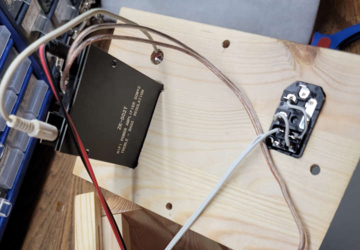 Für die Lautsprecherbox Di wurde der Bluetooth Verstärker Fosi Audio ZK-502T gewählt. Dieser Verstärker hat neben dem Lautstärkeregler auch noch Klangregler für Bässe und Höhen. Damit sollte die ggf. etwas zu kräftige Hochtonwiedergabe der Lautsprecher-Chassis korrigiert werden können. Bei diesem Verstärkermodul ist die integrierte Klinkenbuches nach hinten gerichtet, so dass dieser Audioeingang über eine Verlängerung nach vorne geführt werden musste.